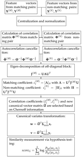 The selected canonical vectors can be leveraged to measure the similarity between an arbitrary pair of images through a binary hypothesis test. Let ( x r , y c ) be an arbitrary pair of global feature vectors. The exact joint distribution of ( x r , y c ) likely varies from one dataset to another and does not admit an explicit characterization. Here we make the simplifying assumption that x r and y c are jointly Gaussian. Specifically, we assume that ( x r , y c ) N ( 0 , Φ ( M ) ) if they come from two matching images, and ( x r , y c ) N ( 0 , Φ ( N ) ) otherwise, where N ( 0 , Σ ) denotes a multivariate Gaussian distribution [34] with mean 0 and covariance matrix Σ . Given ( x r , y c ) , the transformed feature vectors are computed as follows: