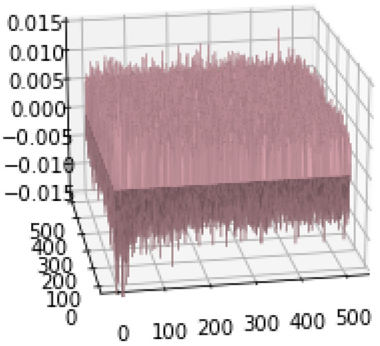 Since Λ is a diagonal matrix, it follows that ( w 1 , v 1 ) , ( w 2 , v 2 ) , , ( w k , v k ) are mutually independent with ( w i , v i ) N ( 0 , S ˜ i ( M ) ) for i { 1 , 2 , , k } in the case where ( x r , y c ) is a matching pair. We shall further assume that Π is also a diagonal matrix, which is justified by the fact that in practice Π is often very close to a zero matrix (see Figure 3 and Figure 4 for some empirical evidences). As a consequence, ( w 1 , v 1 ) , ( w 2 , v 2 ) , , ( w k , v k ) are mutually independent with ( w i , v i ) N ( 0 , S ˜ i ( N ) ) for i { 1 , 2 , , k } in the case where ( x r , y c ) is a non-matching pair. To check whether the given two images match or not, one can perform a binary hypothesis test regarding the underlying distribution of ( w , v ) : i = 1 k N ( 0 , S ˜ i ( M ) ) vs. i = 1 k N ( 0 , S ˜ i ( N ) ) .