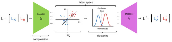 Compression by a lossless encoder removes redundancy. The observations in L are then represented in the latent space defined by z and clustered according to their normalized compression distance [13]: a tractable approximation of the algorithmic complexity (image inspiration from [6]).