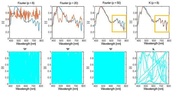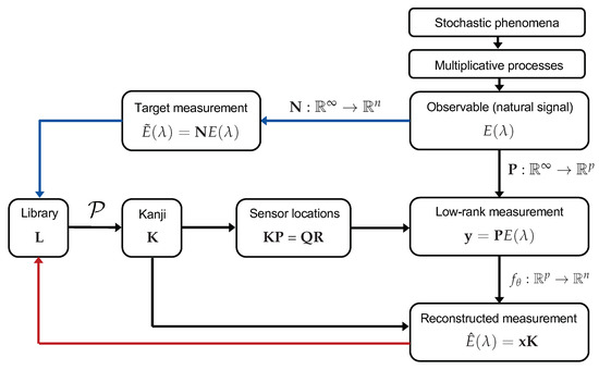 In order to illustrate the differences between data-driven and universal bases, let us take the example of finding the optimal sensor locations for encoding an observed high-dimensional signal. We suppose that the measurement process is modeled by a matrix P: , where . For a simple (1D) signal such as a normalized spectral power distribution, , the measured output is given by