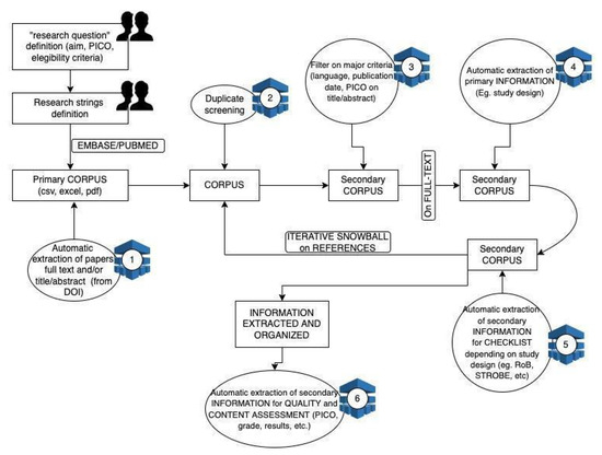 Usually, systematic reviews are conducted by expert panels chosen mainly for their scientific and clinical reputation. Those who are excluded are individuals with clear financial conflicts and those whose professional or intellectual bias can diminish the credibility of the review. Once the research question, the inclusion and exclusion criteria, and the research protocol are defined, the panel experts perform the operative part of the review process (Figure 1). The researchers perform a comprehensive query in multiple databases using search strings and download the records’ information (i.e., title, abstract, and other metadata such as the authors’ names, journal name, and DOI). The researchers perform title and abstract screening based on the predetermined inclusion and exclusion criteria and on the PICO elements. In this phase, usually, the majority of the articles are discarded [21]. Subsequently, the researchers extract and read the full text of each individual record included in the new set of articles and eliminate irrelevant articles. Then, from the final set of articles, the researchers extract the information and evidence relevant for the research question.