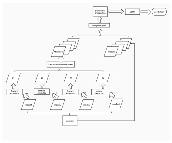 - Fuse multi-modal data in the form of sequences and use recurrent neural network (RNN) models for feature extraction. This operation requires traversing the input from the first time-step to the last one, which is computationally expensive [25]. Even though improved RNN variants such as LSTM [26] and GRU [27] can effectively reduce the difficulty of parameter updates in training, the sequential arrangement of different modal data introduces unnecessary sequential priors, which can force the model to learn an unreasonable one-way information flow while understanding the inter-modal relationships to fit the main features, affecting the effectiveness of feature extraction [28,29].
