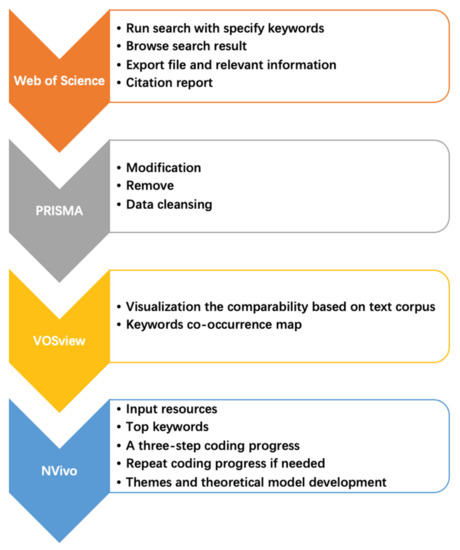 Scholars emphasized the need to choose effective tools for qualitative research from a wide range of technologies [45]. Figure 1 outlines the research approach and each selected software. To put this in order, this study incorporated the Web of Science (WoS) database, allowing advanced searches and export of the file, which included an overview of the paper, title, abstract, and keywords [45]. In order to ensure that the report’s accuracy and reliability, this study imported PRISMA 2020 [14] and followed its guidance to modify or remove the data. PRISMA flow can be used as the basis of reporting systematic reviews, which benefits in providing a clear and complete process, thereby facilitating reliability [14].