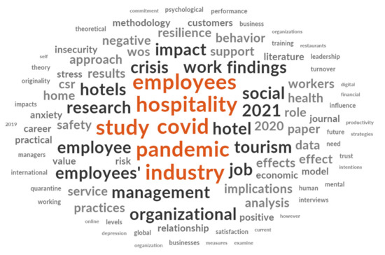 In order to extract accurate keywords, this study only uses the title, keywords, and abstracts for word frequency analysis. Table A2 (Appendix B) listed the top 100 words. “employee” (433 count, 2.02% weighted), “covid” (310 count, 1.44% weighted), “hotel” (239 count, 1.11% weighted) and “hospitality” (235 count, 1.09% weighted), “working” (207 count, 0.96% weighted) appeared. There are also some keywords shown exciting clues, such as “health” (207 count, 0.96% weighted), “employed” (120 count, 0.56% weighted), “mental” (78 count, 0.36% weighted). “responsibility” (74 count, 0.34% weighted), “customer” (64 count, 0.30% weighted), “resilience” (61 count, 0.28% weighted), “safety” (57 count, 0.27% weighted), “insecurity” (57 count, 0.27% weighted), “stress” (57 count, 0.27% weighted), “home” (56 count, 0.26% weighted), “change” (50 count, 0.23% weighted), and “risk” (50 count, 0.23% weighted). Figure 4 shows the top 100 frequency words cloud.