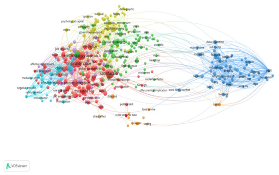 This study utilized the visualization tool VOSviewer to produce Keyword co-occurrence analysis [46]. Figure 5 visualizes the keywords co-occurrence map. The red cluster and green cluster are in the center of the network, which also shows that the theme frequently appeared recently. These themes can be considered as consequences of employees in the hospitality and the COVID-19 contexts, such as turnover intention, layoff, and emotional challenge. The yellow cluster consists of terms related to the hospitality field organizational performance with COVID-19. In addition, the blue cluster includes terms that marginal and edge themes, such as research methodology and demographic characteristics.