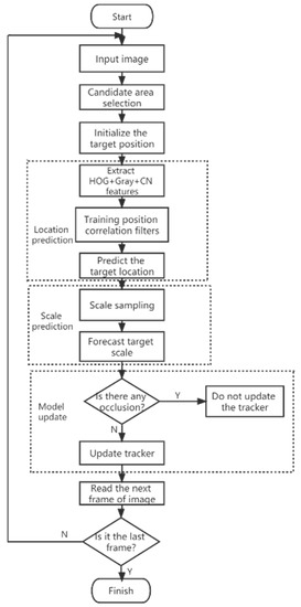 The overall flow of the algorithm in this paper is as follows: (1) Input image containing the target image and its surrounding contextual background information; (2) Extracting manual features HOG, CN, Gray, fusing them and obtaining the fused features; (3) Bringing the fused features into the KCF algorithm to calculate the location and multi-scale response, where the optimal scale of the target is obtained using the scale pyramid approach; (4) To avoid the tracking drift problem caused by the update of wrong frames during the tracking process, we adopt an anti-occlusion detection strategy to update the corresponding model only for the images that meet the requirements. (5) An efficient correlation operation is performed by using the Discrete Fourier Transform (DFT). The response graph is obtained through the inverse Fourier transform (IFFT). The position of the maximum response score is the new position and the best scale of the target in the current frame, then the relevant filter is updated accordingly. The specific flow chart is shown in Figure 1.