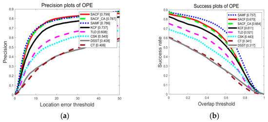 Under the aforementioned hardware and software experimental conditions, the average FPS of our proposed improved algorithm SACF is 70.138. As can be seen from Figure 3, the algorithm in this paper ranks first among all algorithms in tracking accuracy and second among all algorithms in tracking success rate, second only to SAMF algorithm. The tracking accuracy and success rate are improved by 6.2% and 5.9%, respectively, compared with the original KCF algorithm, the tracking accuracy reaches 79.9% and the success rate reaches 67%. The proposed improved algorithm SACF_CA has a tracking accuracy of 78.7%, which ranks second among all algorithms, a success rate of 65.4%, which ranks third among all algorithms, which improves the tracking accuracy and success rate by 5% and 4.3%, respectively, compared to the original algorithm.