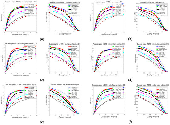 Comparison of tracking accuracy and success rate of various algorithms on (a–f) video sequences. (a) In-plane rotation sequence. (b) Fast motion sequence. (c) Background clutter sequence. (d) Lighting change sequence. (e) Scale change sequence. (f) Out-of-plane rotation sequence.
