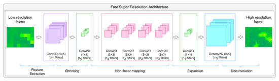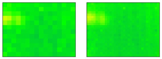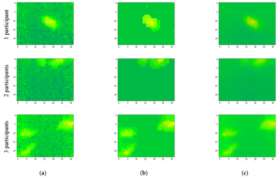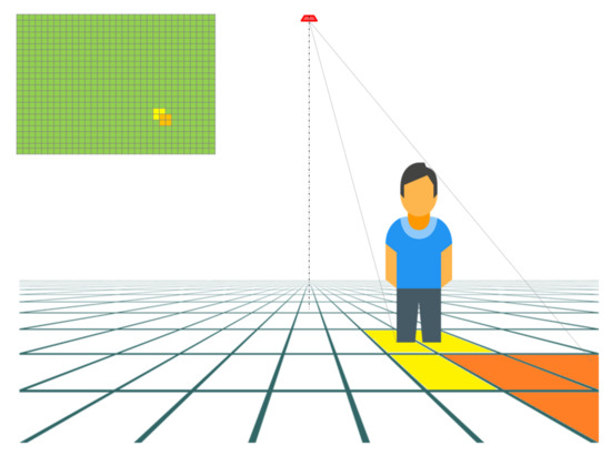 - Panasonic Grid-EYE sensor (https://industrial.panasonic.com/jp/products/pt/grid-eye. Accessed 29 January 2022): This sensor is among the cheapest ones available in market. This sensor, however, has two main drawbacks: (1) it has very narrower angle (i.e., ) and (2) offers only a resolution equal to 8 × 8 pixels. The limited coverage makes its usage in practice require dense deployment to cover a single room. Nevertheless, such a sensor does not offer high enough resolution to train a super resolution network for our approach to run properly. That said, this sensor could benefit from our proposed method itself after training. In other words, after the super resolution network is already trained, it can be applied directly to data collected by this sensor to increase their resolution.