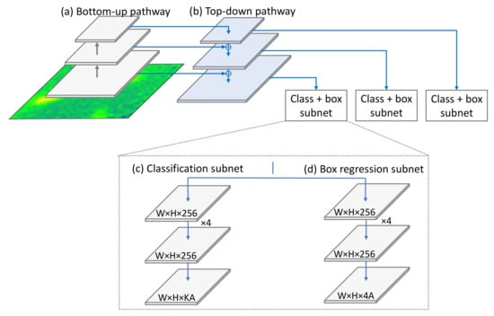 - The backbone: The backbone calculates the feature maps at different scales. This is usually a typical convolutional network that is responsible for computing the feature map over the input image. In our work, we opted for the conventional ResNet34 architecture [20] as a backbone for RetinaNet. It has two parts:
