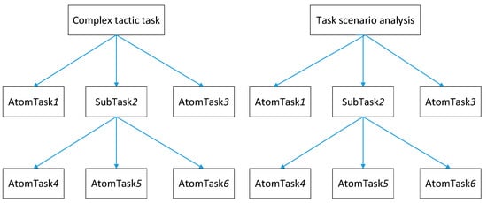Task scenario analysis is to decompose the tactical task execution scenario into multiple combinable atomic tasks based on combat tasks, domain knowledge, and materials, and determine the logical structure between these atomic tasks. Among them, the experience formed in actual combat and training, the handling plan for emergencies, and the data of operational simulation can all be used as the material for scenario construction and analysis; domain knowledge is the facts and rules that military experts have been able to explain clearly and refine into rules. Rules, etc., are the basic constraints of scene construction and analysis. The parent–child relationship between tasks is formed through the decomposition mapping of high-level tasks and atomic tasks, which can be described by the task hierarchy diagram shown in Figure 1. Each complex task corresponds to a scene, and the atomic task describes more specific action details, so the execution of the atomic task is regarded as an atomic scene constructed by the scene. The composability of subtasks indicates whether a group of subtasks can be combined into a more complex task. Only subtasks that belong to the same parent task can be combined. For example, in Figure 1, the actions {AtomTask4, AtomTask5, AtomTask6} are combinable, and {AtomTask1, AtomTask5} are not combinable.