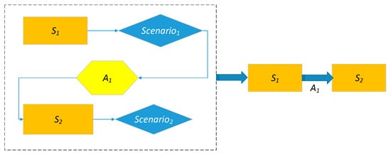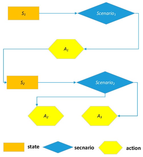 Step 5: Rule expression. According to the grammatical structure of the defined ECA rules, the corresponding rules can be obtained by substituting the trigger events, conditions, and actions obtained in each state into the grammatical structure of the rules. The essence of rule extraction is to express the state transition process in the form of rules, as shown in Figure 3. Illustrated as follows: S1 is the initial state of Scenario1, and A1 occurs the Scenario1 to S2, which means the S1 transfer to S2 by A1.