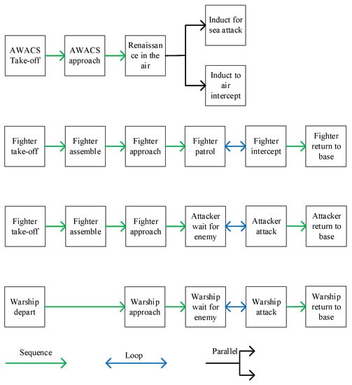 Decompose task dependencies. Based on the “task decomposition diagram”, further analyze the sub-task execution structure and dependencies of the air–sea jointed anti-sea assault mission, and draw a “task execution structure diagram” (as shown in Figure 4).