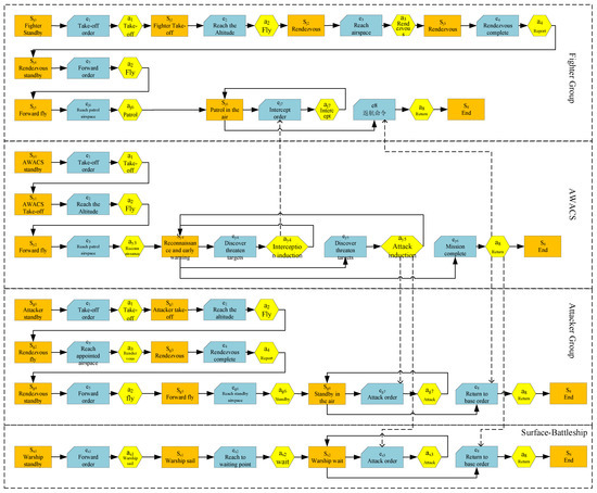 Based on task analysis, combined with domain knowledge, analyze and list various possible states, events, actions, and new states after the actions during combat operations, and obtain “air–sea jointed anti-sea assault scenario analysis diagram”, as shown in Figure 5.