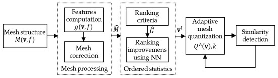 The algorithm operates within four basic steps: (i) computation of geometrical and topological features over the whole 3D mesh structure; (ii) extraction of the vector of vertices ordered according to their features’ ranking ; (iii) adaptive mesh quantization depending on the selected sample mesh region, and (iv) similarity description computation.