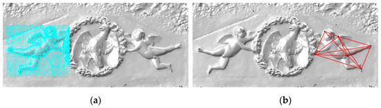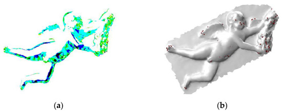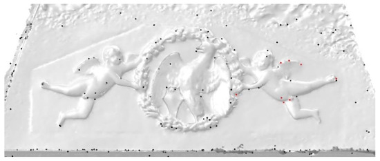 Supplementing the tabular data, Figure 7 illustrates the spatial distribution of the matched vertices by quantization. Regardless of the presented results in the above table, we can notice, even perceptually, the similarity of the black points’ distribution in the sample area of the left angel ornament and the red points’ distribution on the right. This is promising information for the final matching step.
