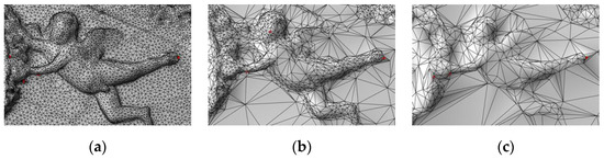 Red dots illustrate the invariance of vector to different strengths of optimization: (a) original 3D mesh without deletions, (b) 80% deleted vertices and (c) 95% deleted vertices.
