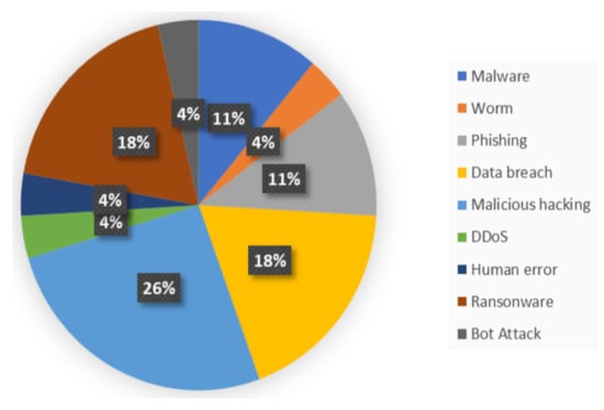 The assessment of cyber-attack by type is presented in Figure 2, the results of which support the evidence presented in Figure 1, showing that malicious hacking activities top the list of the type of cyber-attacks at 26%, the aim being to gain unauthorised access using known malicious password cracking techniques, for example, brute force or dictionary attacks. Data breach and ransomware attacks are second at 14% each, while attacks related to phishing and malware follow at 11% each. Cyber-incidents classed as human error, bot attacks, worms and DDoS are the most rare, at 4% each.