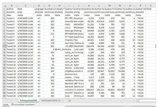 Twitter data was chosen based on its popularity with microblog services for sentiment and opinion analysis in detecting cyber-bullying, cyber-terrorism, etc. [17]. Twitter API was employed in streaming live tweets for the past 14 days on the Orange Data mining toolbox [41]. To use the Twitter API, it is required to obtain the Twitter API credentials, which contain the key and secret passwords. With the API, query parameters relating to specific keywords such as ‘wordlist query’, ‘search by’, ‘language’, ‘allow retweets’, etc., can be set, and the data obtained can be saved as Comma-Separated Value (CSV) format. For this study, the search query’s keyword was “yahoo-yahoo”, and a maximum tweet of 5500 tweets was returned. The complete dataset is available in the Zenodo repository at [42]. Figure 3 shows the Twitter dataset obtained using the #yahooyahoo on a data table containing the tweets content as well as 17 other metadata, which includes ‘Author ID’, ‘Date’, ‘Language’, ‘Location’, ‘Number of Likes’, ‘Number of Retweets’, ‘In Reply To’, ‘Author Name’, ‘Author Description’, ‘Longitude and Latitude’, etc.