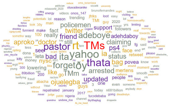 - Abayomi-Alli, A.; Abayomi-Alli, O.; Misra, S.; Fernandez-Sanz, L. Yahoo-Yahoo Hash-Tag Tweets Using Sentiment Analysis and Opinion Mining Algorithms. Zenodo 2021. [Google Scholar] [CrossRef]