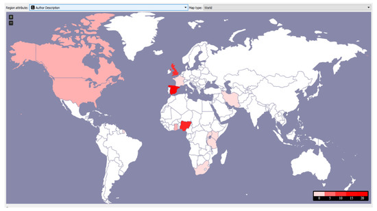 From Figure 5, the color bar differentiates the number of tweets originating from each country in the range 0 to 20 on a scale of 0–4, 5–9, 10–14, and 15–20, respectively. The white locations had no tweets from the #yahooyahoo, while the colored ones had tweets of varying amounts.