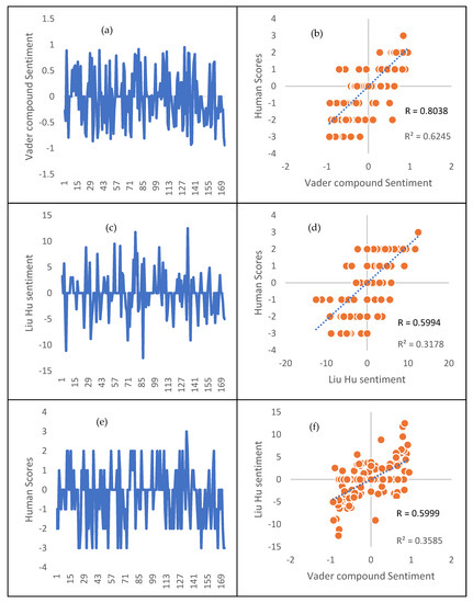 Subplots showing validation results of the tweet sentiment classification. Subplot: (a) Line plot of VADER sentiment scores; (b) Scatter plot of Human and VADER sentiment scores; (c) Line plot of Liu Hu sentiment scores; (d) Scatter plot of Human and Liu Hu sentiment scores; (e) Line plot of Human sentiment scores; (f) Scatter plot of Liu Hu and VADER sentiment scores.