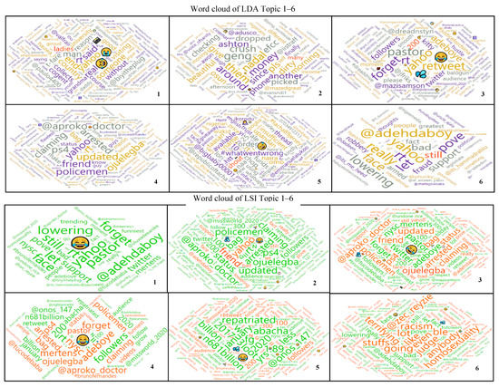 In this case, the LDA and LSI models returned only one topic with the same keywords: yahoo, rt, pastor, forget, and adeboye. However, using the document frequency range between 0.00–1.00, 75280 tokens of 3968 types were returned. We set out for six topics using LDA and LSI; the topics and their keywords are shown in Table 4. Figure 9 shows the cloud of words that constitutes LDA and LSI generated topics 1 to 6, while the topics selected top ten key words and weights are presented in Table 5 and Table 6.