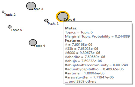 The topics represent the point in the Multidimensional Scaling (MDS) graph, where the size of the point is a function of the Marginal Topic Probability (MTP) for each topic extracted from the tweet corpus. The bigger the size of the point, the stronger the topic is represented by the words in the corpus. Only the LDA topics are visualized using MDS because LDA is easier to interpret than LSI even though it is more computationally intensive. The visualization of the LDA topics with MDS shows that topic 6 has the highest marginal probability of 0.244889, followed by topic 3 and topic 4. Figure 10 shows the LDA topics using MTP with multidimensional scaling points.