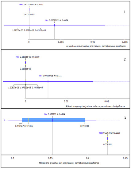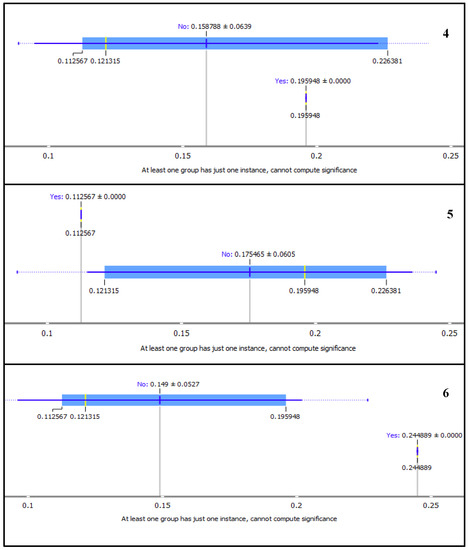Also observed from the box plots in Figure 11 and Figure 12, is the notable separation between yes and no subgroups for topics with high MTP. The ‘yes’ subgroup represents the words for the selected topic, while ‘no’ subgroup are the other words in the corpus. Subplot 6 in Figure 12 shows the good separation between the word frequency for LDA topic six and all others. The MTP of each topic is shown by the ‘yes’ subgroup of each topic as 2.41322 × 10−5, 2.1151 × 10−5, 0.226381, 0.195948, 0.112567 and 0.244889 for topic 1, 2, 3, 4, 5 and 6, respectively. The gap between the subgroups is consistent with the sizes of the points and MTP values of the topics, as shown in Figure 10.