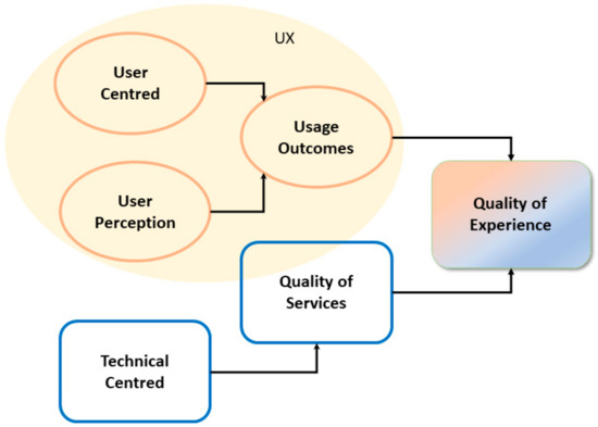 The perspective of QoE can be formulated by combining QoS and UX. Combining factors of UX as part of QoE together with QoS is further discussed in [11]. Although the QoS factor from the technical side is still considered vital, alone, it is not enough to show the satisfaction value of service users. QoS factors such as delay, jitter, loss, error, speed, and good bandwidth do not necessarily result in a high QoE value because there are additional satisfaction factors associated with users that are very subjective, diverse, and unpredictable [4,21], and these also affect UX. Moreover, QoE is not limited to the technology itself but is embedded and becomes active during the interaction between the user and the technology [5].