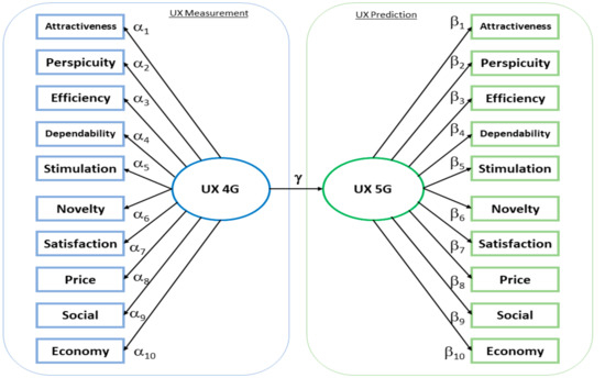 The correlation values in this model are denoted by α, β, and γ, where α1–α10 is the correlation between the measurement of video streaming user experience on the 4G network (UX 4G) with its 10 factors, β1–β10 is the correlation between the predicted user experiences of streaming videos on the 5G network (UX 5G) with its 10 factors, and γ is the correlation between UX 4G variables and UX 5G variables related to user experience in streaming video.