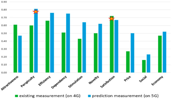 This stimulus-related assessment measures how a new feature or device changes users’ enjoyment of streaming videos. From the survey results, the stimulus significance value for 4G technology is α5 = 0.43 and is β5 = 0.64 for 5G technology. Through this value, it appears that stimulus is in the form of a new device with new technology, in this case, the 5G technology that provides a change in experience rather than an increase in features.