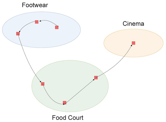 In practice, based on the functions, an indoor building can be classified into various sections. For instance, an airport terminal can be divided into check-in, security checking, waiting room, and boarding sections; a supermarket can be divided into bakery, vegetables, seafood, meat, and cooked food sections. Generally, users’ physical movements have strong correlations with the section he/she is currently in [51,52,53]. For example, in an airport terminal, the majority of passengers will follow the route of check-in, security checking, waiting room, and boarding; and in a shopping mall, people will also show certain navigational hobbies. As shown in Figure 1, a customer first spends some time buying shoes; after that he wants to eat something, and then he may enjoy the big hit movie in the cinema. Through this, we can infer his sequential patterns and so the customer’s behavior is highly predictable.