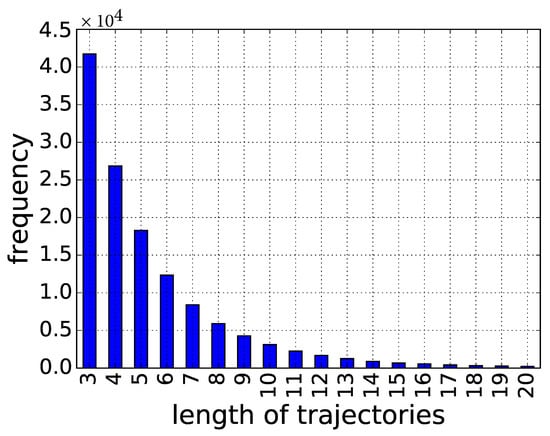 Figure 4 depicts the trend about the number of trajectories w.r.t the length. We omit the trajectories whose lengths are smaller than three, as they are too short to convey meaningful visiting hobbies. As can be seen from the figure, more than 90% of the trajectories tend to access three to nine Wi-Fi access points.