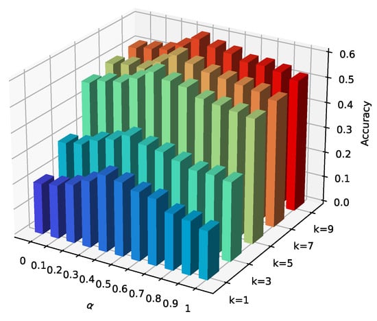 Figure 6 depicts the influence of coefficient on the performance metric . When parameter , the prediction accuracy first shows an increasing and then decreasing trend. Our method exhibits a relatively high performance when . When = 0.4, achieved with improvements of and compared to = 0 and = 1, respectively, implying that both the spatial similarity and contextual similarity contributed to the prediction accuracy.