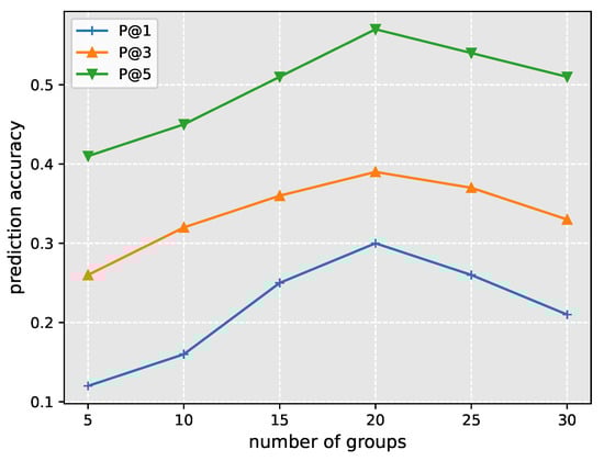 Initially, with the increment of groups, the prediction accuracy increases gradually. We infer that the reason is that at the early beginning there are too many trajectories in the group and the prediction performance of our model may be interfered by the data noise, so with the decrease in data noises, the prediction accuracy rises. When , the prediction accuracy achieves the best score, , , and for P@1, P@3, and P@5, respectively. However, after this, the prediction accuracy shows a trend of decreasing. The reason may be that with the increment of parameter N, the model of the test trajectory has fewer references to make accurate predictions. However, we claim that even though in our experiment the highest prediction accuracy is achieved when , the optimal value for N varies according to different datasets. Because N represents the balance between the positive information and the data noise, the strength of social contagion and interference varies for datasets [54].