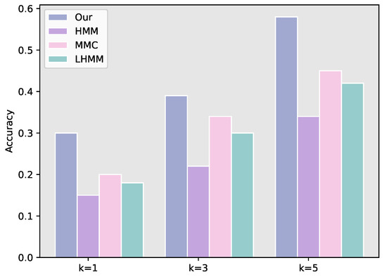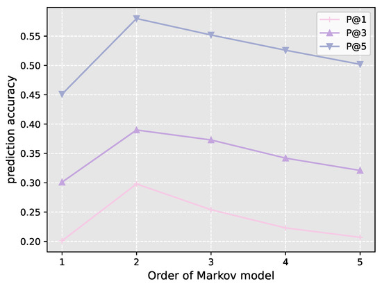 We validated the influence of Markov order on the prediction accuracy of our algorithm, and the results are shown in Figure 8. As can be seen from the figure, when the order of the Markov model increases from one to two, the prediction accuracy increases greatly, our model achieves prediction accuracies of 29%, 39% and 58% for , and , respectively. However, after that, the prediction accuracy declines gradually.