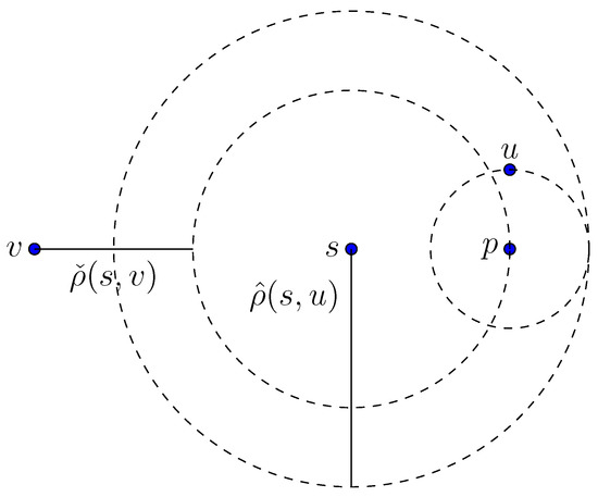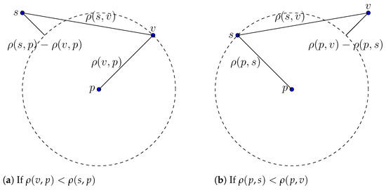 With triangle inequality, we have and . Transforming both inequalities yields and , respectively. Figure 1 gives an illustration for these inequalities in the Euclidean space. □