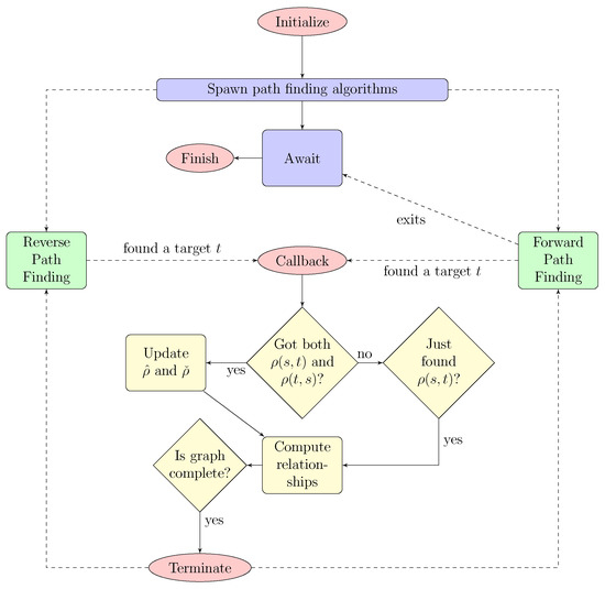 (Preparation). We assumed that is relatively tiny compared to V, such that the pre-computation task stated beyond can be processed in a feasible amount of time and space. Let be an enumeration of all vertices. We cache all values of the mapping in a matrix which we name M. M is asymmetric if is not symmetric, i.e., is not a metric. For the next steps, we will not explicitly refer to this matrix. Whenever a value of type with is requested, it is now clear that we can look up this value in M with time.
