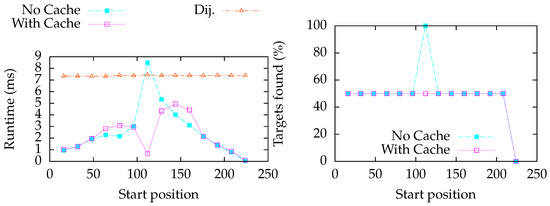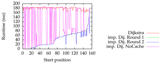 Since the chosen area is relatively small, we cannot see a great variation in the runtime costs for classic Dijkstra. Our implementation using no caches has arbitrary performance: On the one hand, for well-chosen query vertices, it is significantly faster than the classic Dijkstra algorithm. On the other hand, for bad choices, it sometimes performs even slightly worse. Fortunately, caching significantly improves the performance: We observe that in both rounds, our algorithm performs always better than Dijkstra, and most of the time, it performs significantly better. The first roughly 20 start positions in the plot correspond to cached results such that the query can be instantaneously solved by consulting the cache. For Round 2, we see negative spikes (for instance, at Start position ), where a cached result was used that was not cached during Round 1 when querying that vertex.
