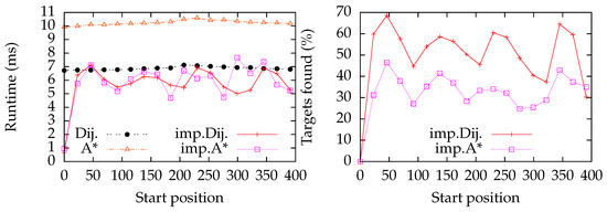 Evaluation of a line graph with equidistantly distributed target vertices; the vertex with index 0 is a target vertex. As in Figure 8, we successively promote vertices with an index from 0 to 400 to a query vertex (this index is reflected by the x-axis, i.e., the start position), and run a query. We do not promote any target vertex to a start vertex, except for index 0. The curves Dij. and A* measure the time for Dijkstra’s algorithm and the A* algorithm for finding the shortest paths to all target vertices. The curves imp. Dij. and imp. A* measure our implementation using Dijkstra’s algorithm and the A* algorithm, respectively.