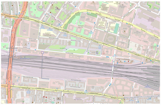 Visualization of the Munich dataset via OpenStreetMap, covering the indexed area [48.14, 48.145] north latitude and [11.54, 11.543] east longitude from www.openstreetmap.org (accessed on 19 December 2021) with a scale factor of 16. The map is oriented north-up. © OpenStreetMap contributors.