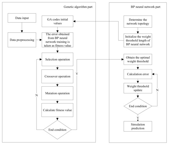 The implementation steps of the neural network prediction model based on genetic algorithm are mainly divided into two modules, the genetic algorithm part and the BP neural network part. The specific process is shown in Figure 1, and the specific implementation steps are as follows.