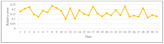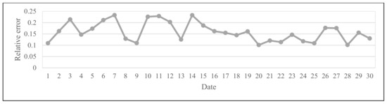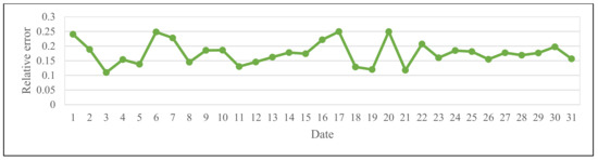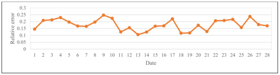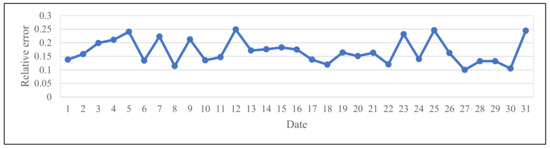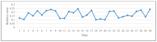 In the second group of experiments, we performed relative error evaluations. Taking the free cash flow data of G Company from 1 January 2019 to 30 June 2019 as the test data, the relative error was evaluated by using the proposed prediction model, as shown in Table 4 and Figure 3, Figure 4, Figure 5, Figure 6, Figure 7 and Figure 8. Among them, relative error refers to the ratio of the absolute value of the difference between the predicted value and the actual value of the day to the actual value of the day.