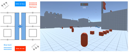 The map was created using the libraries ProGrids [12] and ProBuilder [13] inside Unity. These libraries allow for the easy creation of maps and their mirroring. There are no materials on the map, but only on the required elements like player, boxes and similar. Controls are simple, using W, A, S and D for movement, SHIFT for faster running, and the left mouse click for picking up and dropping boxes. Players cannot collide with each other, but boxes can collide with other boxes and missiles. Figure 1 shows the game map and an in-game screenshot.