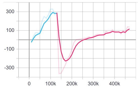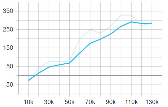In the first training, there was a bot in the blue team, and a human player in the red team. No swapping between teams was made during the training. It lasted for 1 h 51 min and 17 s, and the cumulative reward is shown in Figure 2.