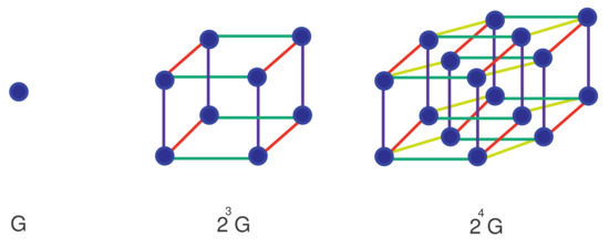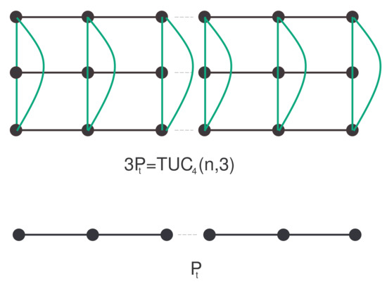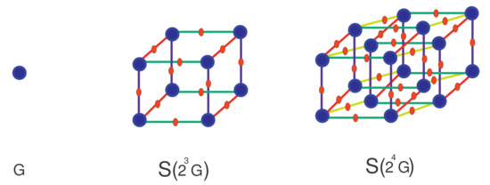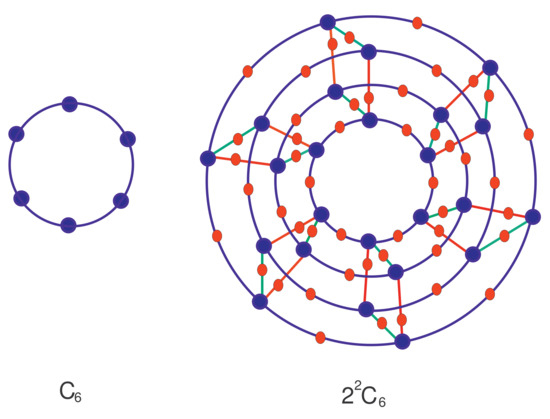 Subdivided graph obtained by inserting new vertex at each edge, i.e., let and x be the new vertex and replace each edge with two edges and to form subdivided graph . In a similar way, we obtain shown in Figure 4 for and when is a single vertex graph. There are and vertices and edges of , respectively.