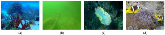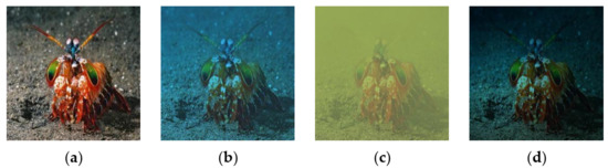 Clear underwater images can provide first-hand information about the structure, texture, and color of underwater scenes and objects, and are vital for many underwater operations, such as marine archeology, seafloor mapping, and marine biological research [1,2,3,4,5]. However, due to the complexity of underwater environment, underwater images are prone to several degradation problems [6,7], which impact their utilities in underwater applications. Firstly, underwater images are affected by the wavelength-dependent attenuation of light in the water body, and present different degrees of color deviation depending on light propagation distance and water body property. Secondly, underwater images are degraded by the scattering effects caused by particles in the water body. These particles alter the directions of light, and cause blurriness and contrast reduction in underwater images. In shallow water, the refraction of light rays by the water surface may even cause caustics, which alters the actual appearance of objects of interest [8,9]. Moreover, illumination deficiency caused by light attenuation and non-uniform lighting is also a non-negligible issue, because in regions with insufficient lighting, the visibility of details is often limited. This issue is especially important for images in the deep sea, where non-uniform artificial illumination is the only light source. In Figure 1, we present four samples of underwater images with different degradation conditions for demonstration. Here, Figure 1a–c present degradation problems of bluish color deviation, contrast reduction, and insufficient illumination, respectively, and Figure 1d is an example of a clear underwater image with no degradation. All these images are from the unpaired real-world underwater image subset of the EUVP dataset [10].