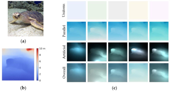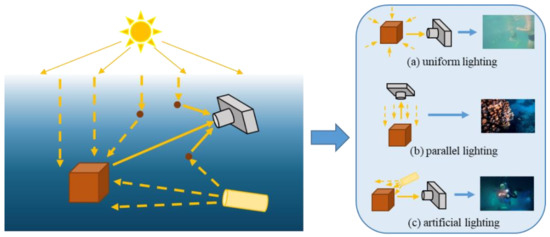 In real-world conditions, illumination of underwater images can be extremely complicated. Due to the absorption and scattering effects in the water body, incident light is often degraded before reaching the object, and thus brings initial color deviations to the underwater images. Furthermore, in the deep sea, artificial illumination is the only light source, and its non-uniformity often results in uneven brightness and limited visibility in the underwater images. To simplify the simulation of underwater lighting parameters, we use the combination of the following three basic patterns to approximate real-world underwater illumination: (a) uniform pattern with constant intensities for simulating shallow-water illumination, (b) parallel pattern whose intensities degrade with depth, and (c) artificial pattern that provides spatially uneven illumination. Diagrams and real-world examples of these patterns are presented in Figure 2. For simplification, we also assume and are identical and use parameter κ to adjust the relative intensity of backscattering light.