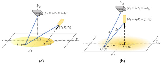 The difference of arbitrary and fixed light modes. (a) Diagram of artificial lighting with arbitrary orientation. (b) Diagram of artificial lighting with orthographic orientation. In the diagrams, represents the location of light source, represents the project of light center, is the location of camera, is the location of a photographed scene point, represents the distance from scene point to camera, is the distance from scene point to light source.